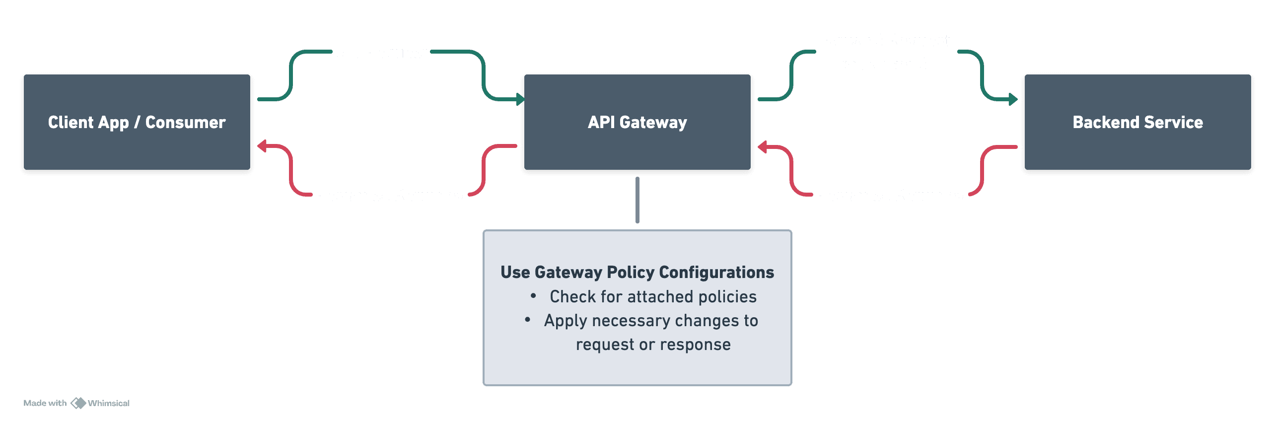 When a request is made, the gateway checks for any attached policies like routing, load balancing, mocking, or caching before forwarding the request to the backend.