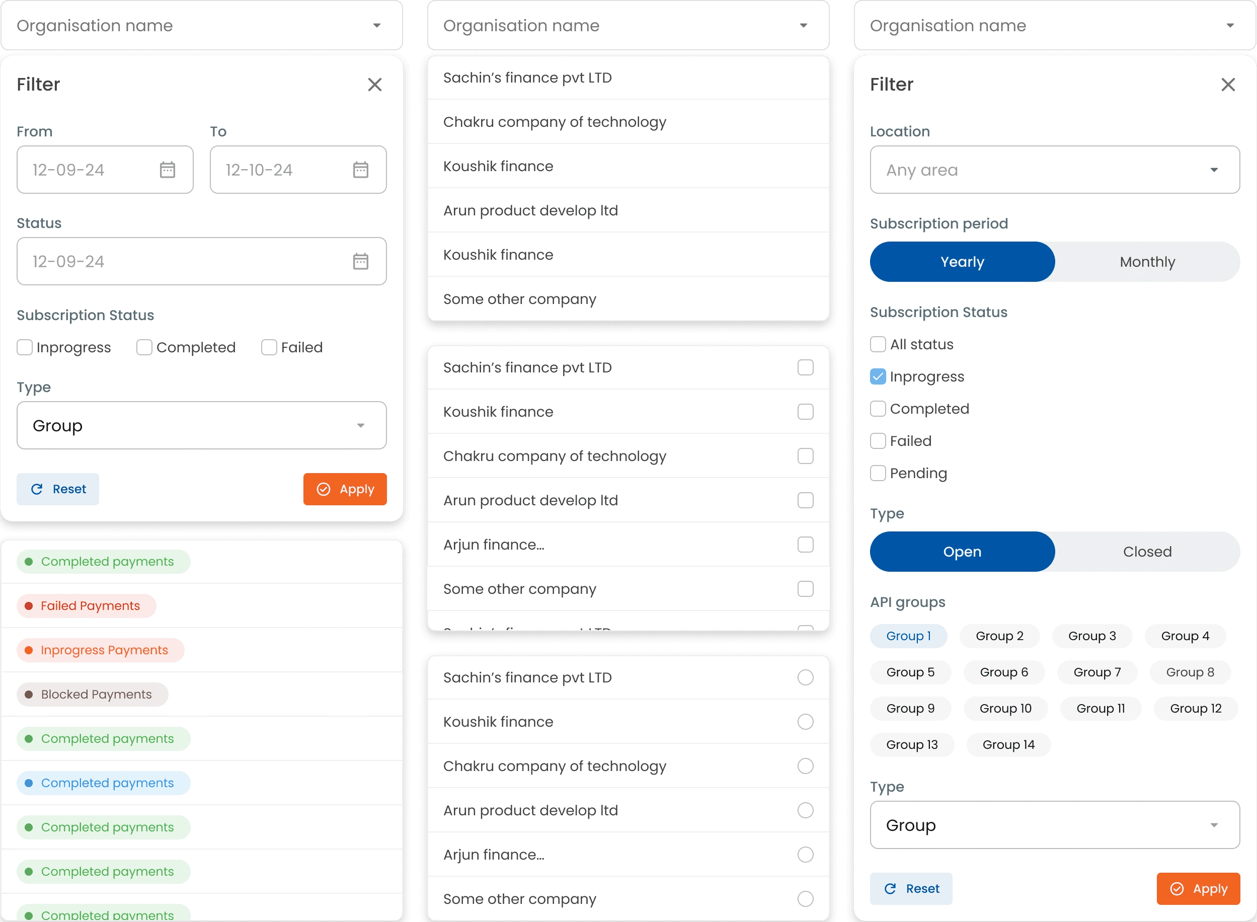 The filter system is built as a drawer-based component, allowing advanced filtering without occupying persistent screen space. It is composed using existing UI elements such as dropdowns, checkboxes, radio buttons, text inputs, and date pickers, ensuring consistency across the system.